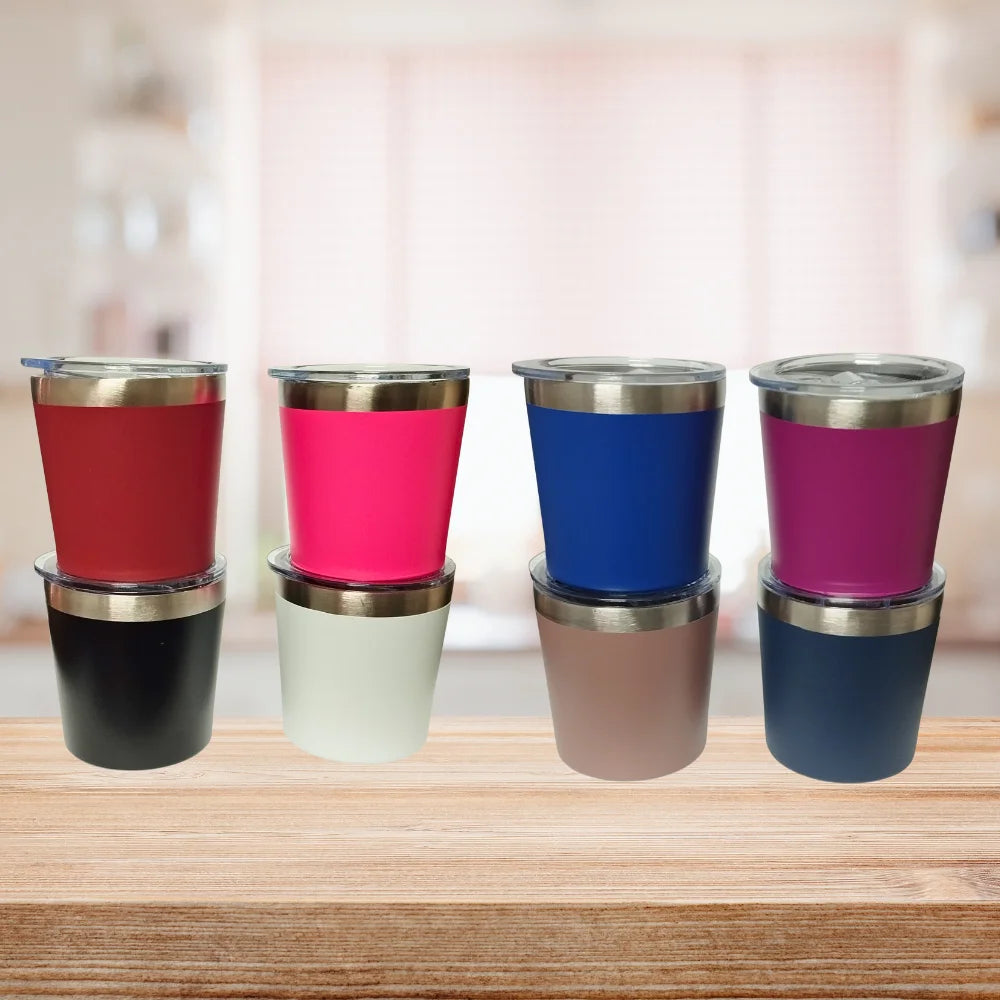 Copo térmico de aço inoxidável com acabamento liso e capacidade de 200ml, material livre de BPA e acompanha tampa.